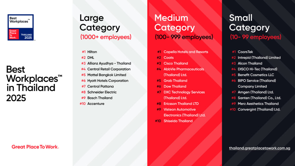 กรุงเทพฯ ประเทศไทย – 13 พฤศจิกายน 2025 – Great Place To Work® องค์กรชั้นนำระดับโลกด้านวัฒนธรรมองค์กร เผยรายชื่อ Best Workplaces™ in Thailand 2025  อย่างเป็นทางการภายในงานแถลงข่าวและพิธีมอบรางวัลสุดยิ่งใหญ่ ณ โรงแรม Millennium Hilton Bangkok เพื่อเฉลิมฉลองให้องค์กรที่เป็นแบบอย่างแห่งความไว้วางใจ ความเท่าเทียม และภาวะผู้นำที่ให้ความสำคัญกับ “คน” ในการขับเคลื่อนการเปลี่ยนแปลงในทุกอุตสาหกรรม